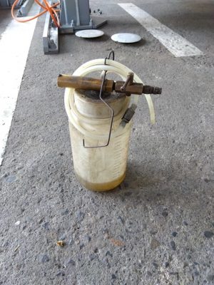 写真の道具はエアを使って整備士1人でもフルードを交換できる道具です